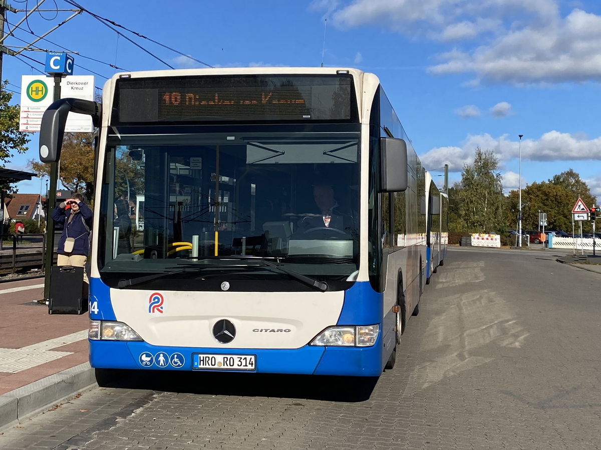 Endhaltestelle Dierkower Kreuz am 18. Oktober 2025 steht ein Mercedes Benz Citaro der RSAG Rostock - Wagen 314 von der Haltestelle Warnemünde Hohe Düne Fähre kommend.