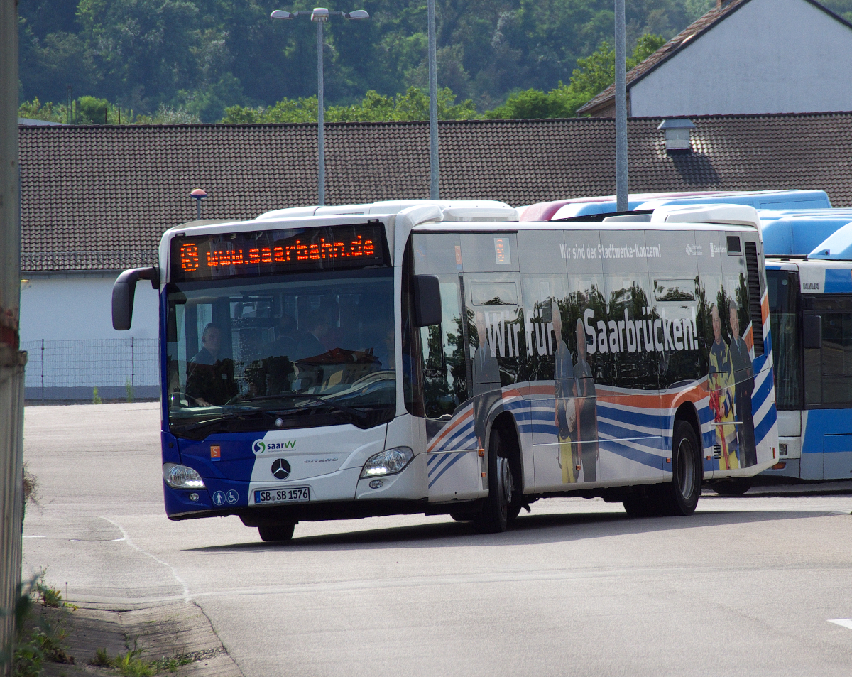 Flott um die Kurve - Ein Mercedes Benz der Stadtwerke Saarbrücken (Saarbahn) hat gerade im Betriebshof die Wartungshalle umrundet. Hoffentlich hatten sich die Pressevertreter und die "hochkarätigen" Fahrgäste gut festgehalten! Der Bus war zu einer 15 minütigen Pressefahrt unterwegs, es wurde das Lotsensystem " mobisaar 2 für Fahrgäste mit Handicap vorgestellt. An Bord waren u.a. Frau Prof. Wanka (Bundesministerin für Forschung und Bildung) und Anke Rehlinger (Ministerin für Wirtschaft, Arbeit, Energie und Verkehr des Saarlandes). Ich hatte eine Einladung als Mitglied des Vorstandes des VCD Landesverband Saarland. 26.07.2016 Erhard Pitzius