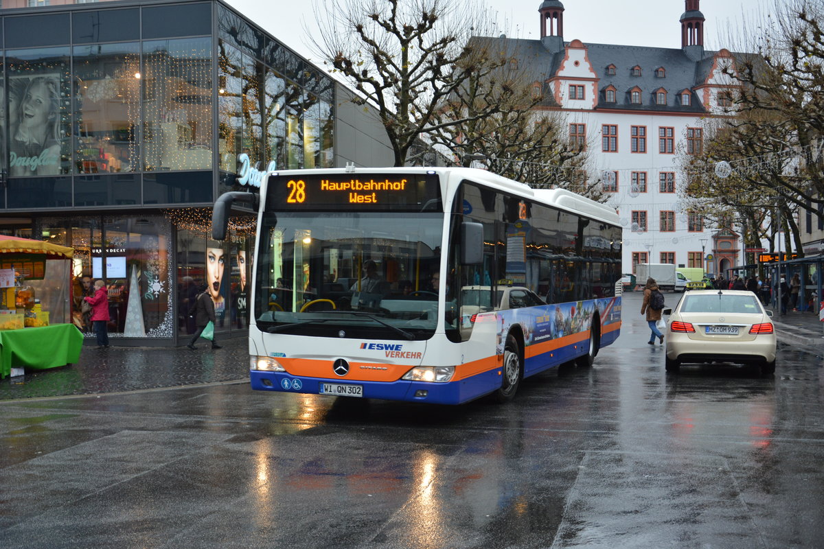 Am 04.12.2015 fährt WI-QN 302 auf der Linie 28 durch die Innenstadt von Mainz. Aufgenommen wurde ein Mercedes Benz Citaro der 2. Generation Low Entry.