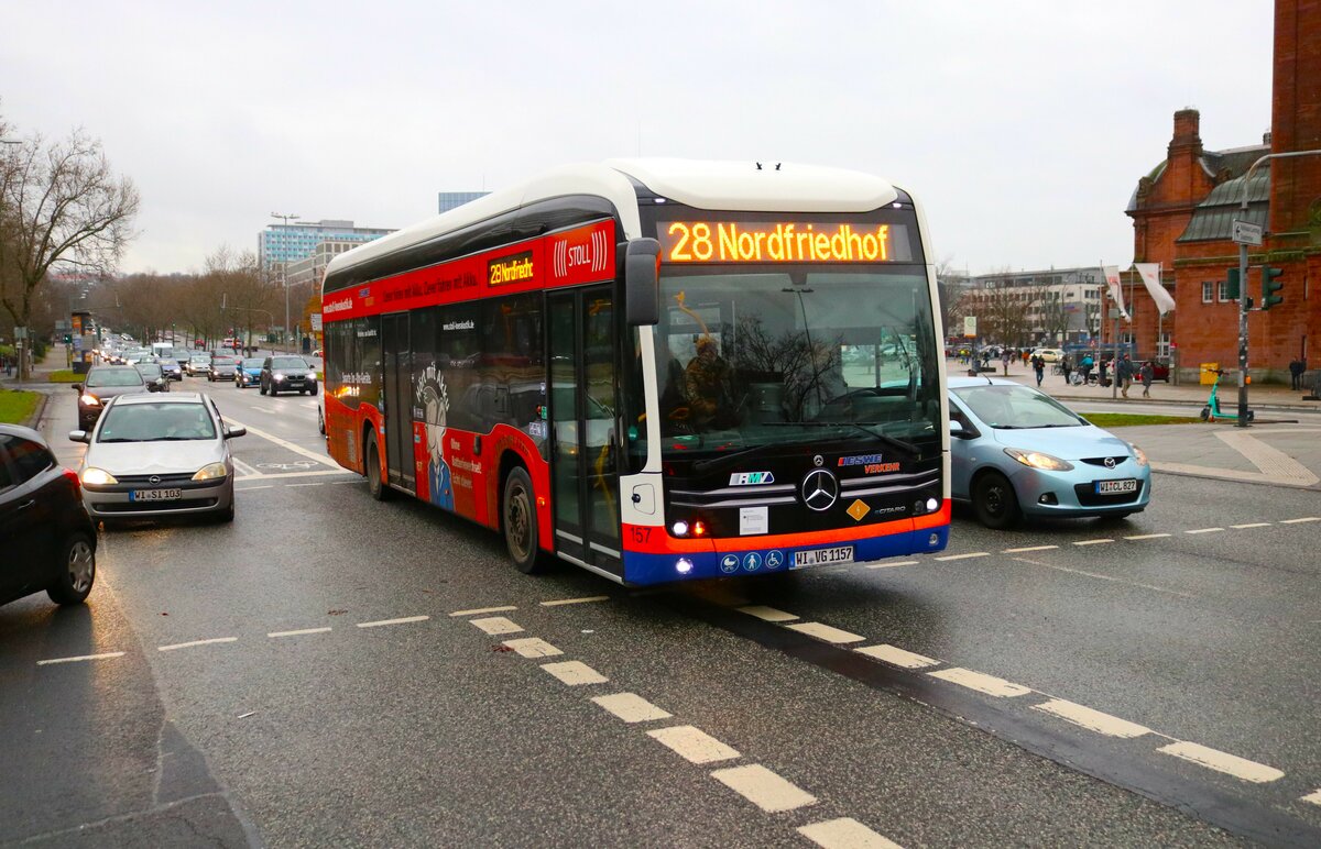 ESWE Verkehr Mercedes Benz eCitaro Wagen 157 am 09.12.23 in Wiesbaden