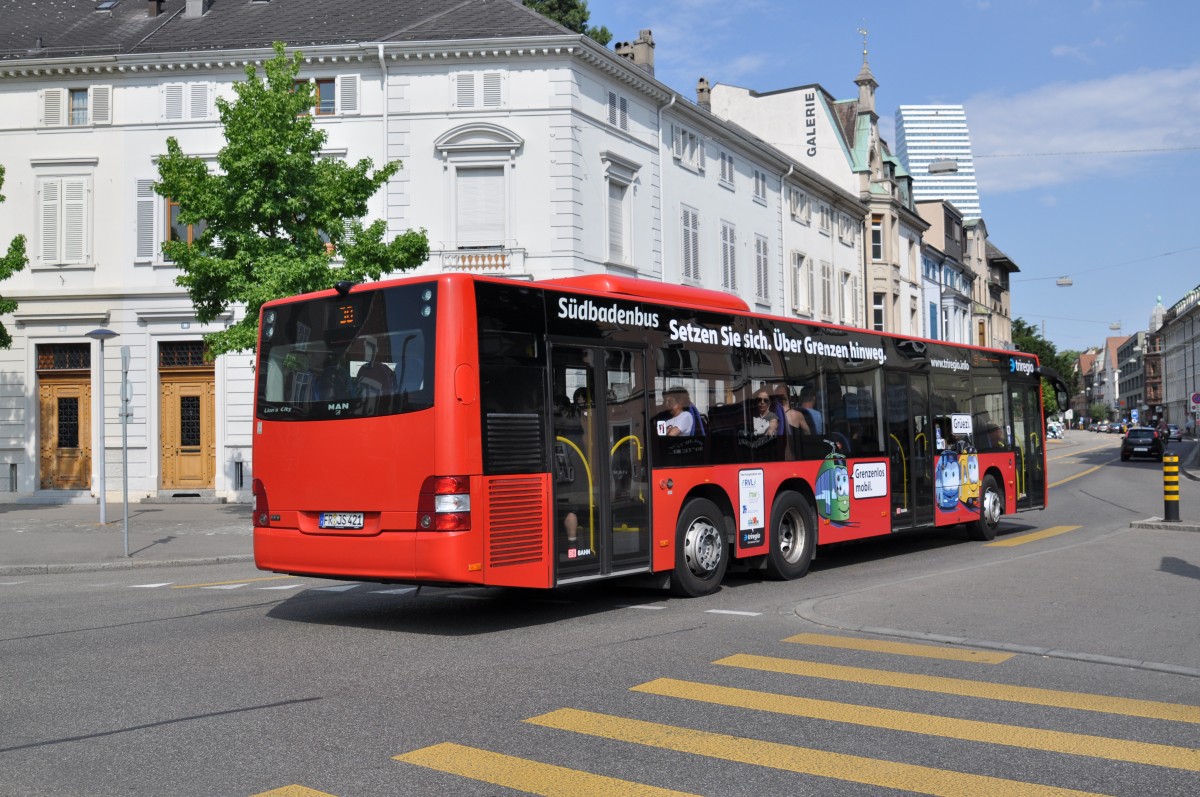MAN Lions City von Südbadenbus auf der Linie 38 verlässt die Haltestelle am Wettsteinplatz und fährt Richtung Rosengartenweg. Die Aufnahme stammt vom 11.06.2015.