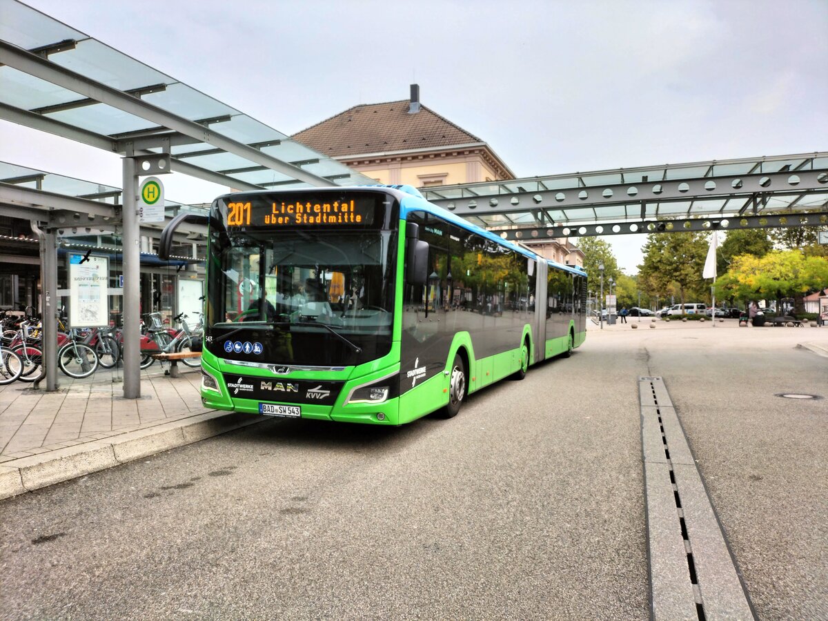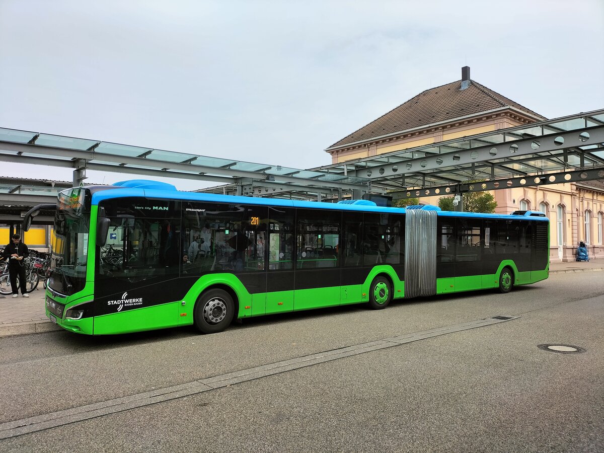 MAN Lion's City 12E, Wagen 192, Stadtwerke Baden-Baden, verlässt die Haltestelle Bahnhof Baden-Baden als Linie 218 am 26.09.2025