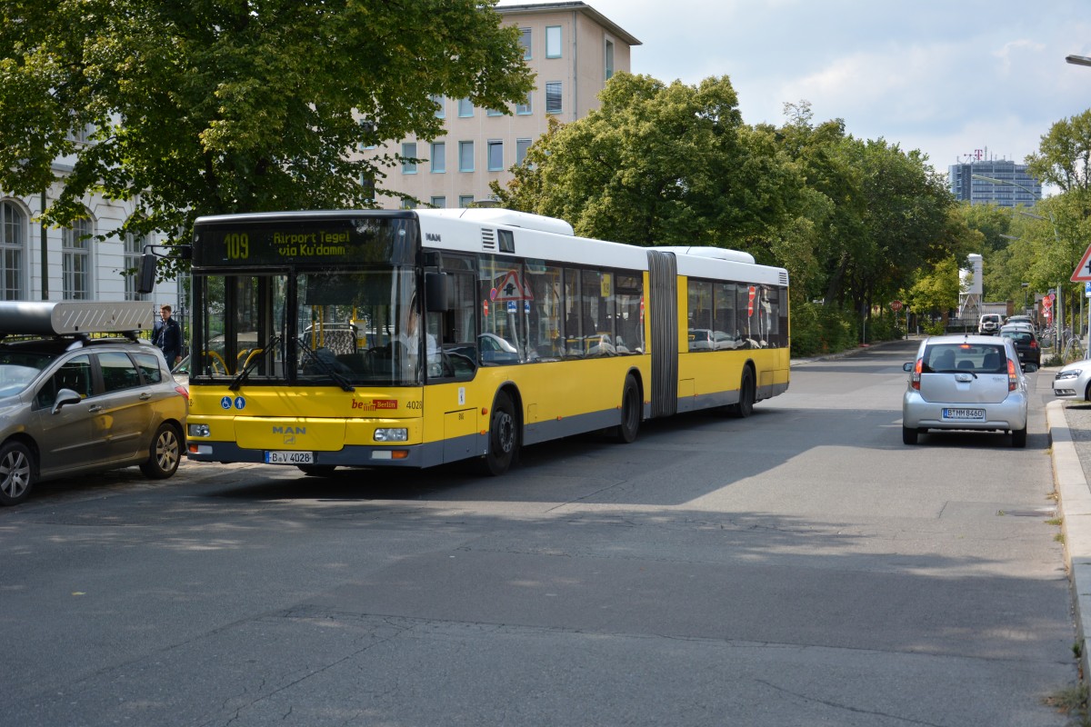 B-V 4028 (MAN NG 313) auf der Linie 109 zum Flughafen Tegel. Aufgenommen am 21.08.2014 Hertzallee Berlin.
