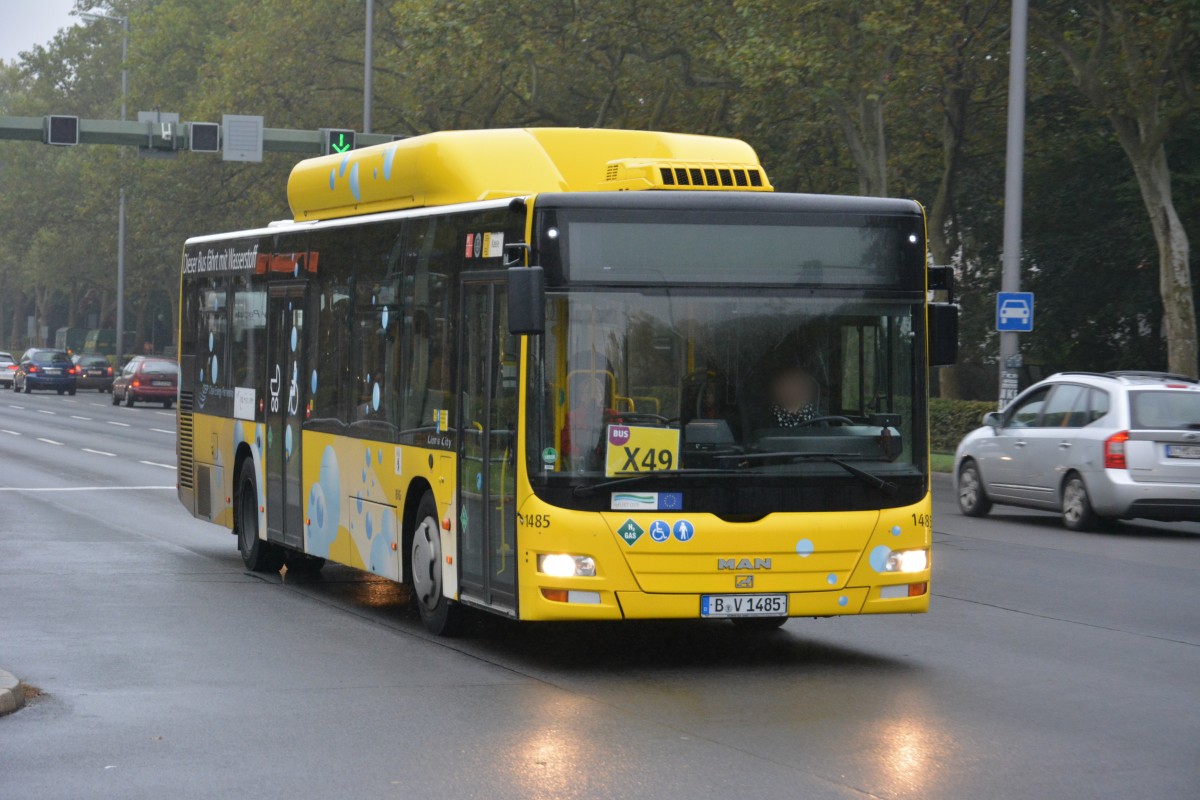 B-V 1485 fährt am 26.09.2014 auf der Linie X49 Richtung Berlin Staaken. Aufgenommen wurde MAN Lion's City mit Wasserstoff Antrieb, Flatowalle.
