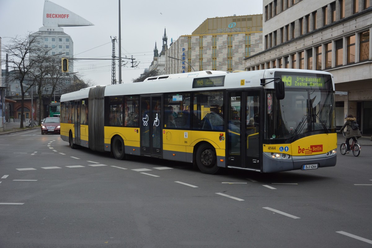 B-V 4144 ist am 30.10.2014 unterwegs auf der Linie M49 zum Zoologischen Garten. Aufgenommen wurde ein Solaris Urbino 18, Berlin Kantstraße.