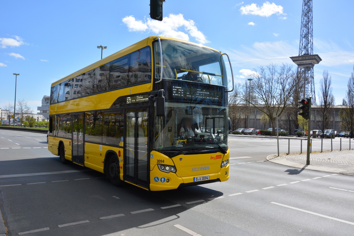 B-V 3094 fährt am 16.04.2015 auf seiner "Stammlinie" X34 nach Hottengrund. Aufgenommen am ZOB in Berlin. Aufgenommen wurde ein Scania Citywide Doppeldecker.