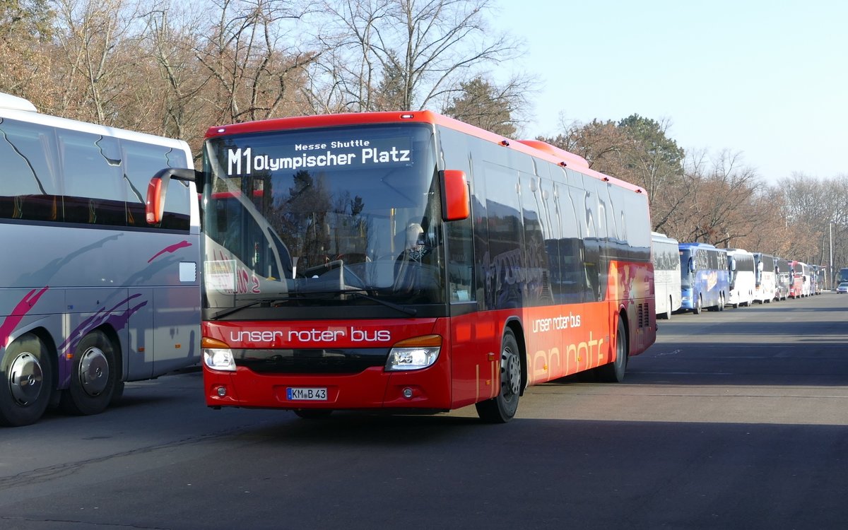 Setra S 415 LE business, KM-B 43, von ''unser roter bus- urb''. Unterwegs als Messeshuttle (Grüne Woche) hier auf dem Olympischen Platz in Berlin im Januar 2020.