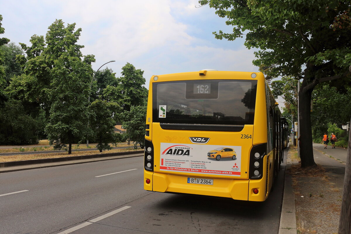 Heckpartie des VDL Citea LLE der BVG in Berlin Rudow an der Endhaltestelle am 02. Juli 2021.