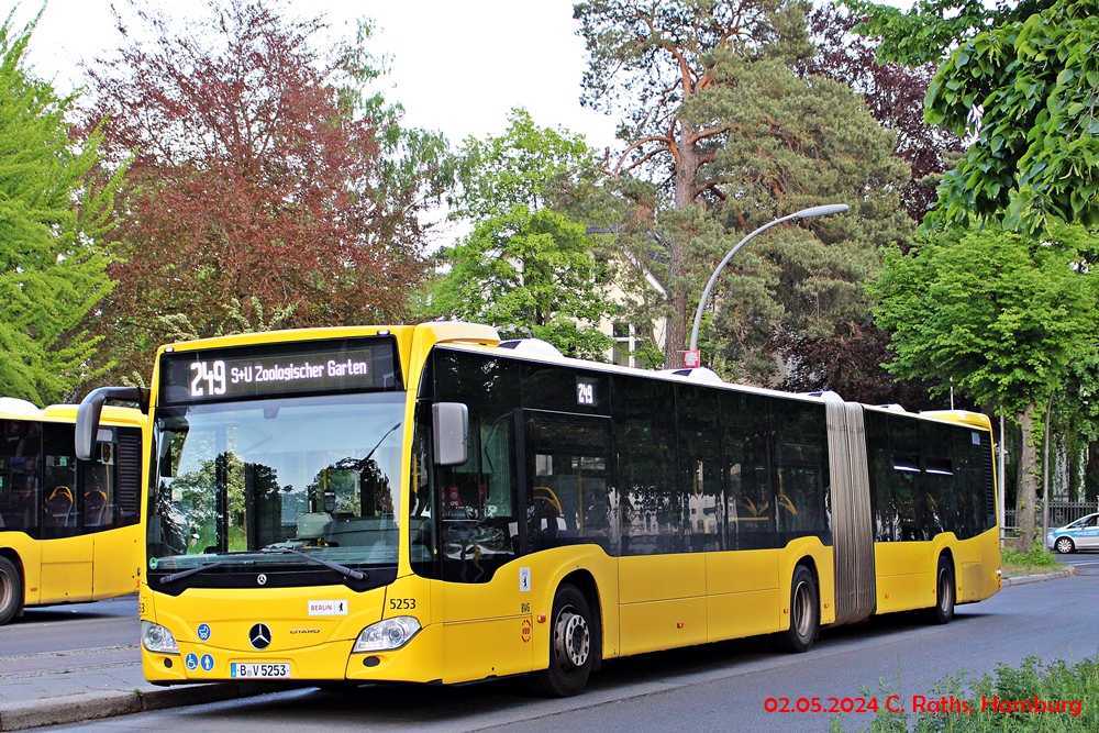BVG Wagen 5253 als Linie 249 am 02.05.2024 in der Rheinbabenallee/Betty-Hirsch-Platz, Berlin