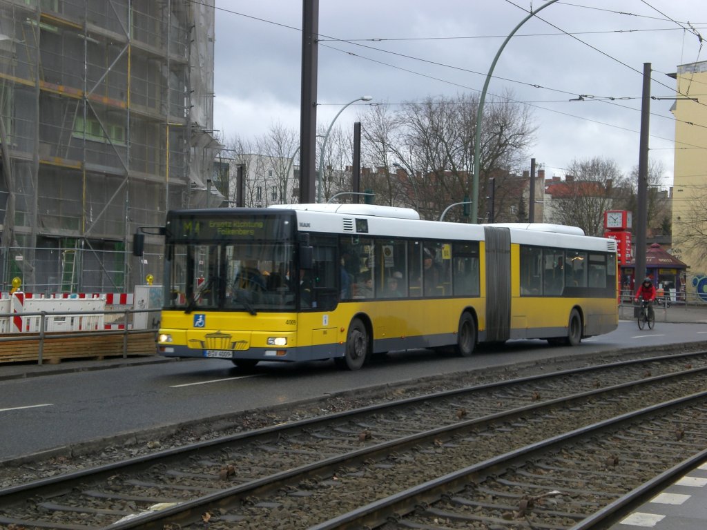 MAN Niederflurbus 2. Generation als SEV für die Straßenbahnlinie M4 zwischen Weißensee Sulzfelder Straße und Prenzlauer Berg Greifswalder Straße/Danziger Straße an der Haltestelle Weißensee Berliner Allee/Indira-Ghandi-Straße.