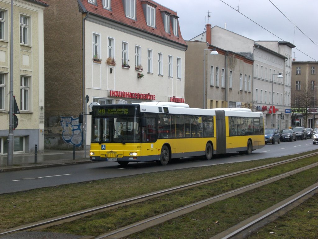 MAN Niederflurbus 2. Generation als SEV für die Straßenbahnlinie M13 zwischen Weißensee Berliner Allee/Indira-Ghandi-Straße und Prenzlauer Berg Prenzlauer Allee/Ostseestraße an der Haltestelle Weißensee Albertinenstraße.