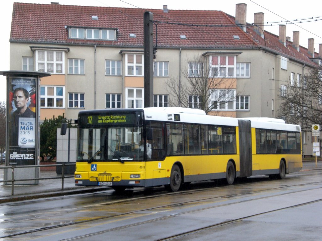 MAN Niederflurbus 2. Generation als SEV für die Straßenbahnlinie 12 zwischen Weißensee Pasedgplatz und Prenzlauer Berg Prenzlauer Allee/Ostseestraße an der Haltestelle Weißensee Berliner Allee/Rennbahnstraße.