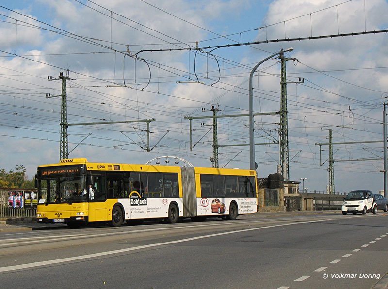 Ein Bus MAN NG 313 der Dresdner Verkehrsbetriebe AG (DVB) mit Werbung für das KIA-Autohaus Zobjak auf Sonderfahrt - Dresden, Marienbrücke, 27.10.2006