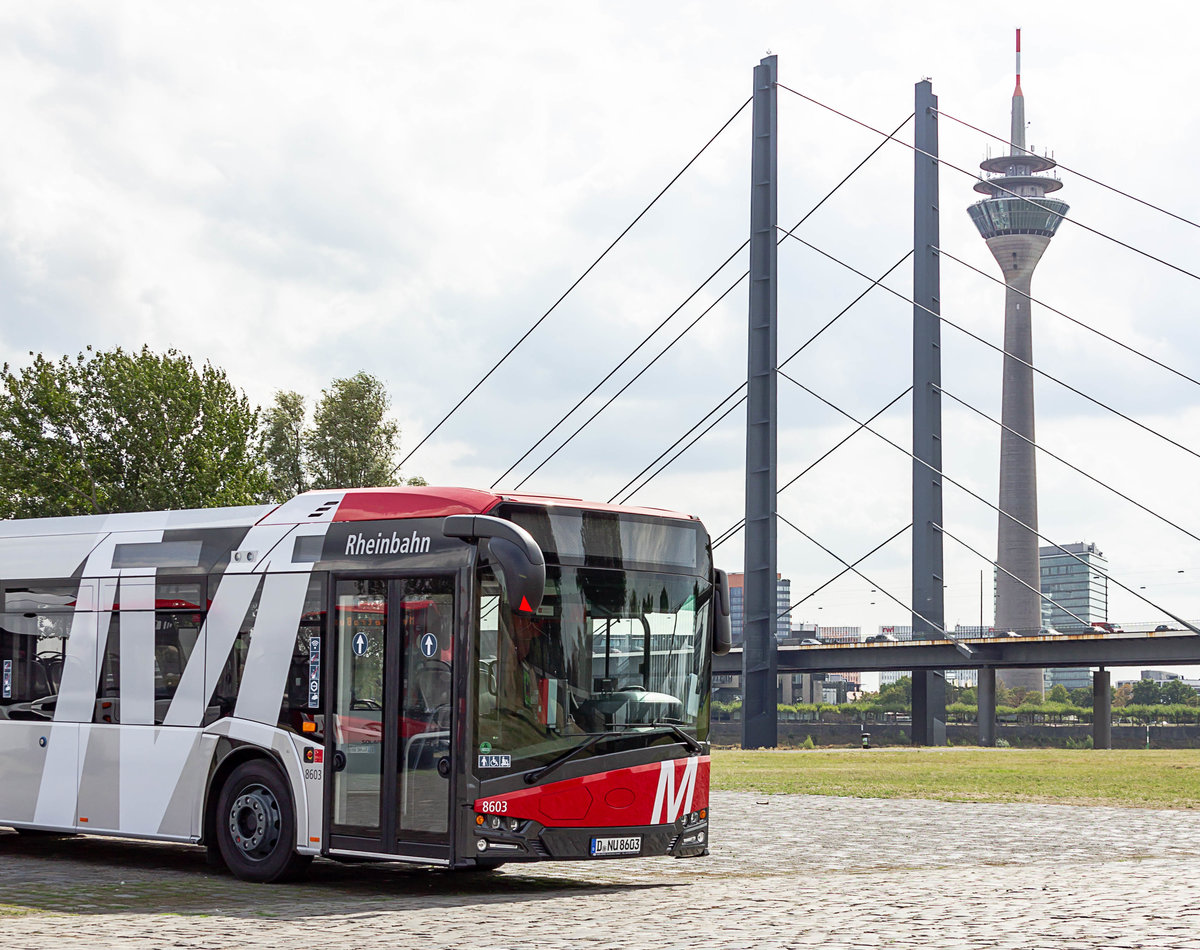 Im Rahmen einer Presseveranstaltung anlässlich der Einführung des neuen Metrobus-Netzes der Rheinbahn konnte ich am 24.8.2018 den Solaris New Urbino 18 mit der Wagennummer 8603 mit Rheinturm und Rheinkniebrücke im Hintergrund auf der Oberkasseler Rheinwiese fotografieren.