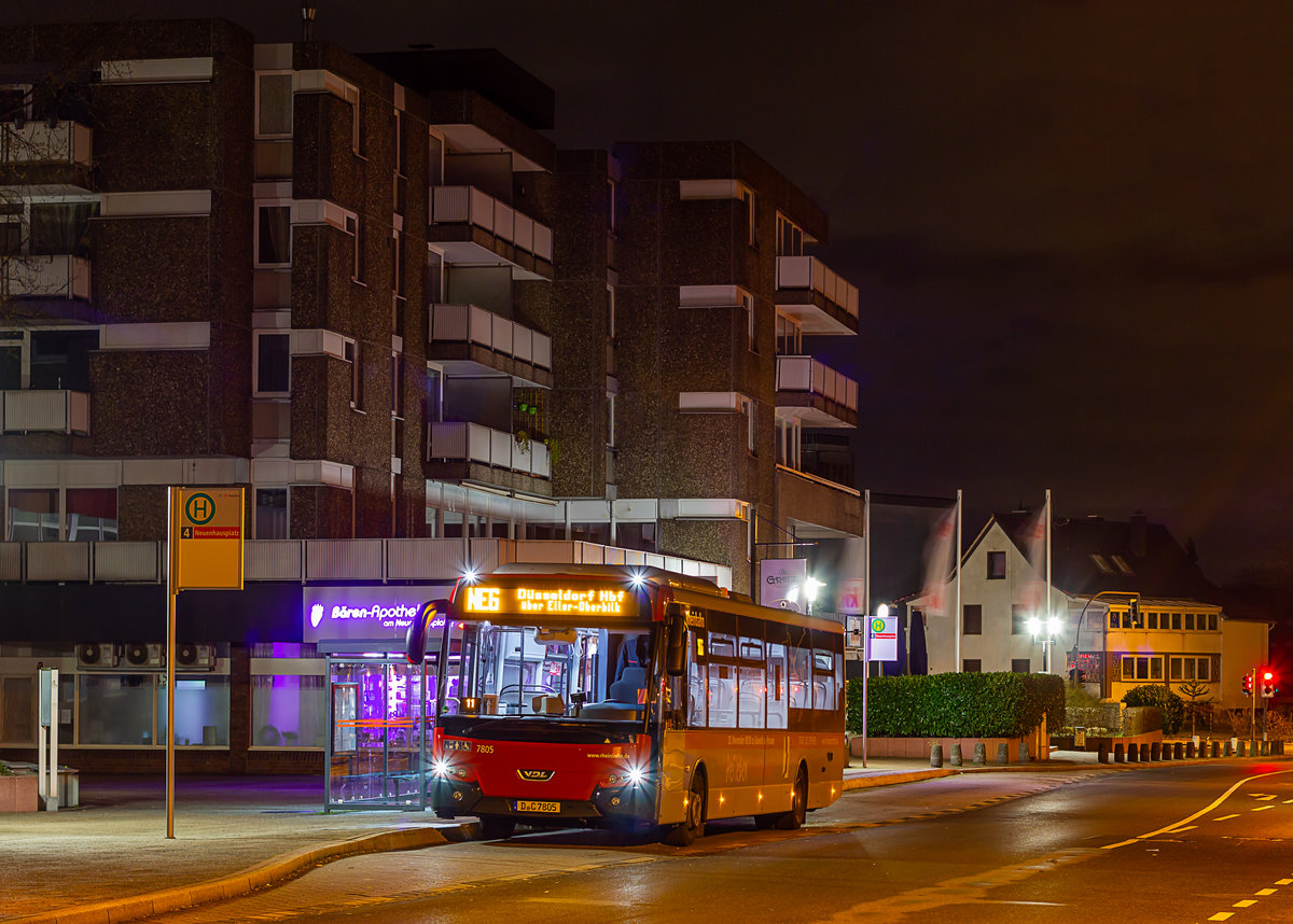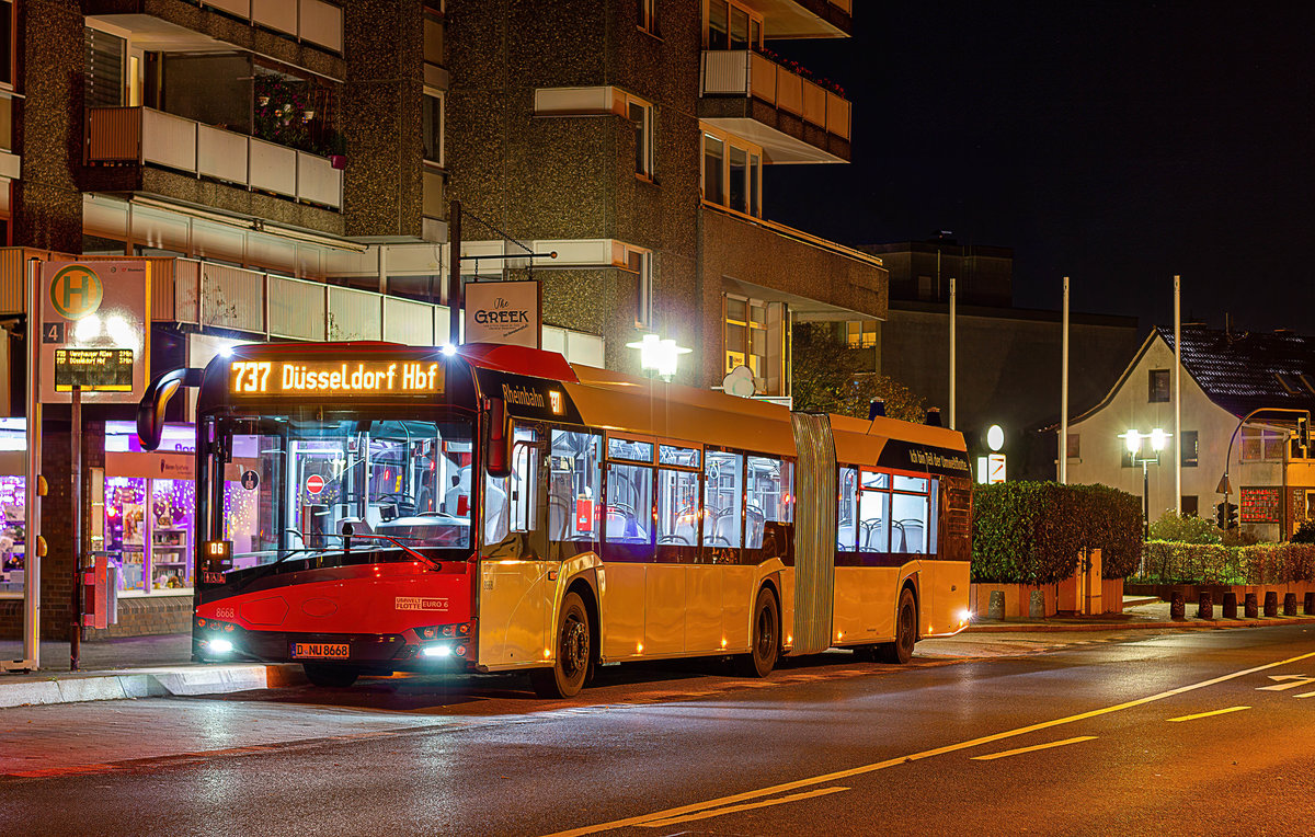 Mittlerweile befindet sich die zweite Lieferserie von Solaris Urbino IV bei der Rheinbahn in Auslieferung. Stellvertretend dafür zeigt sich hier Wagen 8668 am Neuenhausplatz in Erkrath. Im Vergleich zur vorherigen Serie unterscheidet der Wagen sich durch eine Vollklimatisierung und einen Toter-Winkel-Assistenten. Von außen lässt der Wagen sich durch eine Werbebeklebung für die Euro-6-Flotte der Rheinbahn erkennen.
