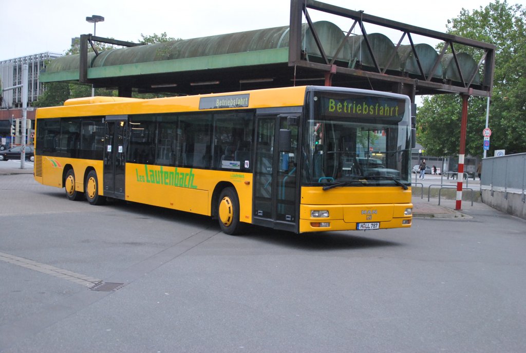 13 m MAN NL, von Subunternehmer Leo Lautenbach, am 28.09.10 in Hannover/ZOB. Leo Lautenbach, fährt für die Regio Bus GmbH. Ich habe vorher mit mit den Fahrer unterhalten. Das war sehr freundlich, sein Bus musst umbedingt ins Internet.