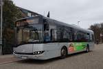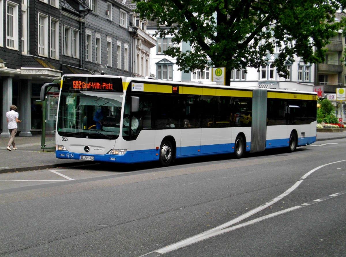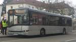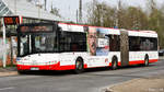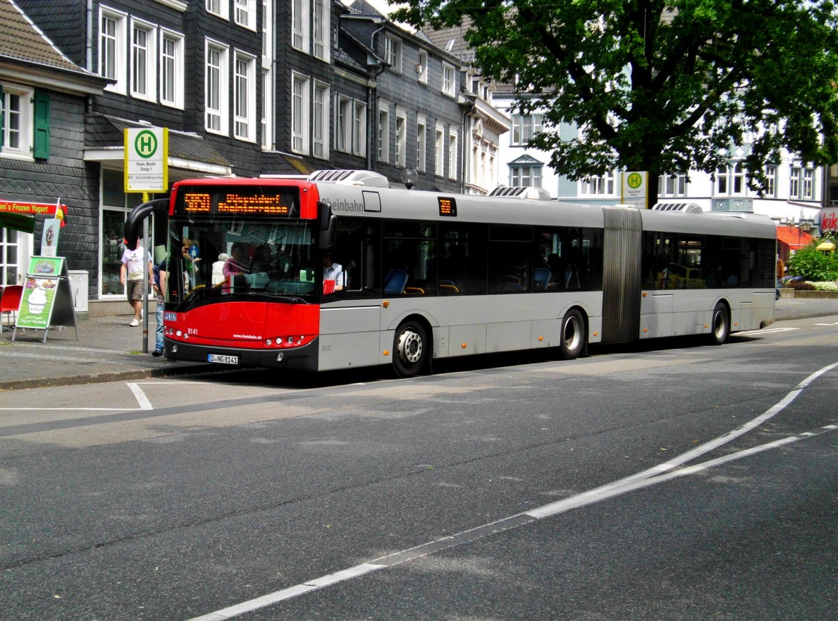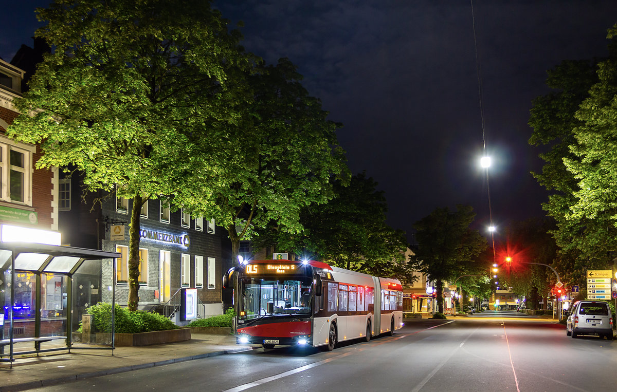 In der Nacht des 18.5.2019 steht Wagen 8525 der Rheinbahn auf der DiscoLinie 5 zur Rheinischen Straße in Haan an der Haltestelle Haan Markt.