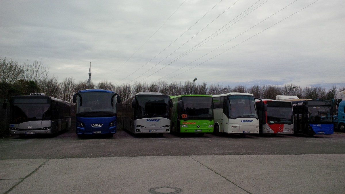 Bunt geht's derzeit zu bei der Hagro Transbus GmbH aus Karlsruhe. Zu sehen sind: einer der acht Solaris Urbino 12 (KA-HT 641), VDL Futura MD (KA-HT 960), Solaris InterUrbino (KA-HT 695), Mercedes Integro (PF-ER 129, Leihwagen), Bova Futura (KA-HT 111), Mercedes Citaro (HT 694) und temsa Avenue (HT 643). Aufgenommen in KA-Grötzingen im Dezember 2015.