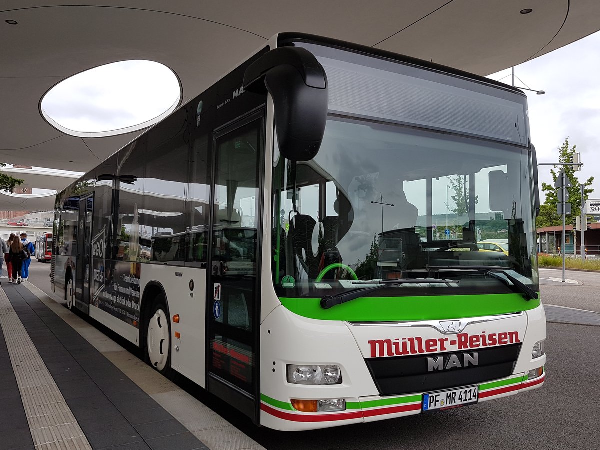 Hier wartet der PF MR 4114 von Müller Reisen auf seinen nächsten Ausflug. Fotografiert am 11.06.2019 am Bahnhof in Pforzheim.