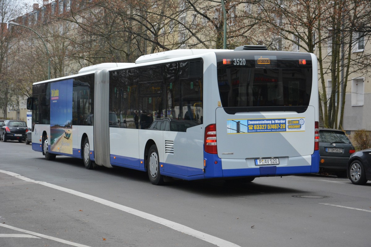 Dieser Havelbus mit dem Kennzeichen P-AV 520 (Betriebshof Stahnsdorf, Mercedes Benz Citaro) fährt am 30.11.2014 für die VIP SEV zwischen Platz der Einheit und Kirschallee.