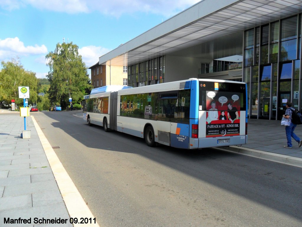 Hier ist ein MAN Gelenkbus von Saarbahn und Bus zu sehen. Das Bild habe ich am 22.09.2011 auf dem Gelände der Universität des Saarlandes gemacht.