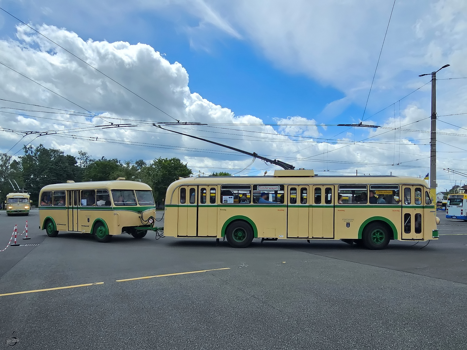 Der 1959 gebaute Uerdingen/Henschel ÜH IIIs Oberleitungsbus hat 28 Sitzplätze und ist hier zusammen mit dem mit 23 Sitzplätzen ausgestatteten Anhänger Orion WH112 aus dem Jahr 1956 zu sehen. (Obus Museum Solingen, Juli 2024)