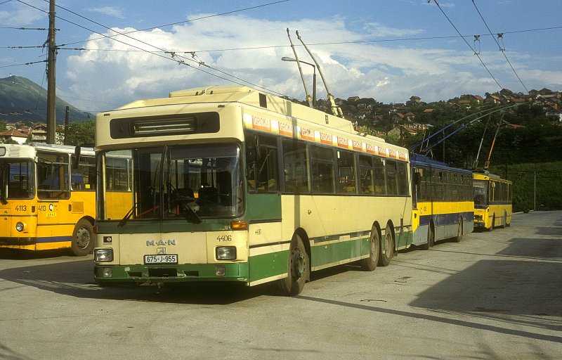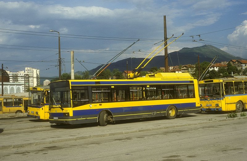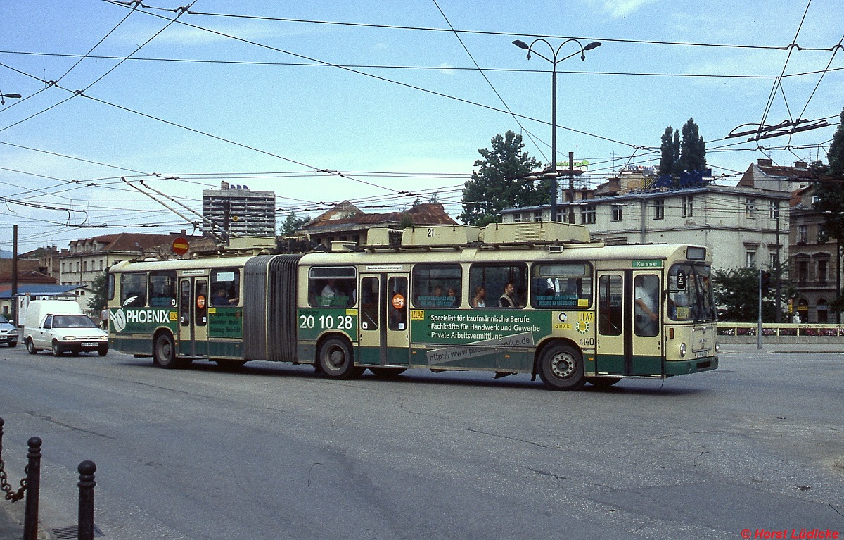 Noch mit Solinger Reklame ist der Obus 4140 im Sommer 2005 in Sarajevo unterwegs. Bei ihm handelt es sich um den ehemaligen Solinger Wagen 21, der im Januar 2004 nach Sarajevo abgegeben wurde. Horst Lüdicke