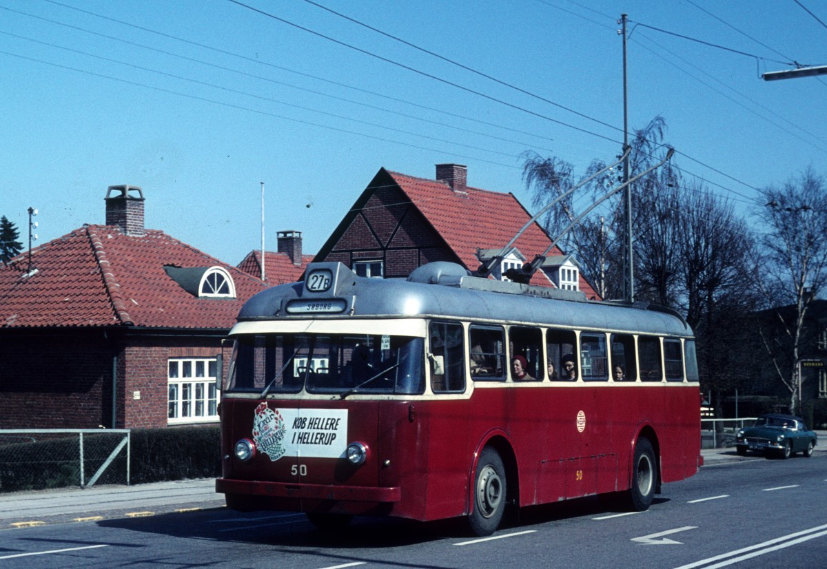 NESA Trolleybuslinie 27B (BUT/Smith, Mygind & Hüttemeier/English Electric Company-Trolleybus 50) Vangede, Ellegårdsvej am 1. Mai 1971. - Als die Strassenbahnbetriebsgesellschaft NESA 1953 ihre Strassenbahnlinien einstellte, kaufte sie 20 neue Obusse (31 - 50) des Typs LETB1 (Länge: 9,7 m, Breite: 2,44 m) mit einem Motor (EG-410C, 150 PS) von der englischen Firma English Electric Company. - Damals meinten viele, dass Trolleybusse das künftige öffentliche Verkehrsmittel in den Städten werden würden. Im Herbst 1971 stellte die NESA die Trolleybuslinien ein.