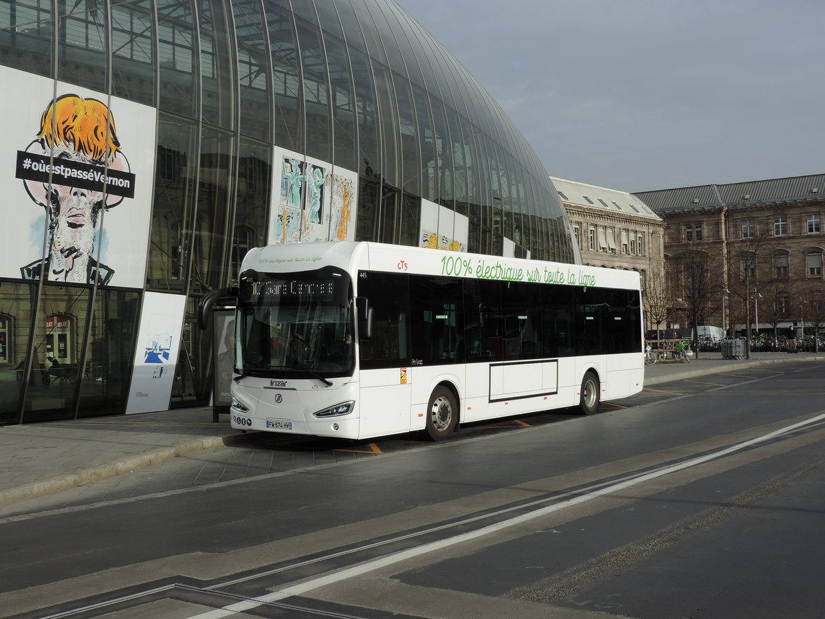 Strassburg - 26. Februar 2021 : Neuer Elektrobus Irizar I2e Nr 445 auf der Linie 10 im Einsatz kommt gerade an der Haltestelle Gare Centrale.