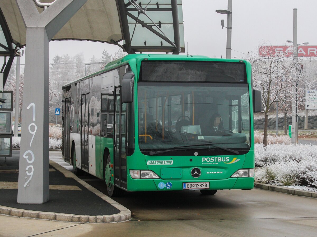Graz. Den wohl dienstältesten Bus in Graz findet man bei der ÖBB Postbus AG: Der Wagen BD 12828 ist der noch der Einzige O 530 Facelift bei der Postbus-Verkehrsstelle in Graz. Am 25.11.2020 war der Bus auf der Linie 630 anzutreffen, hier in Puntigam.