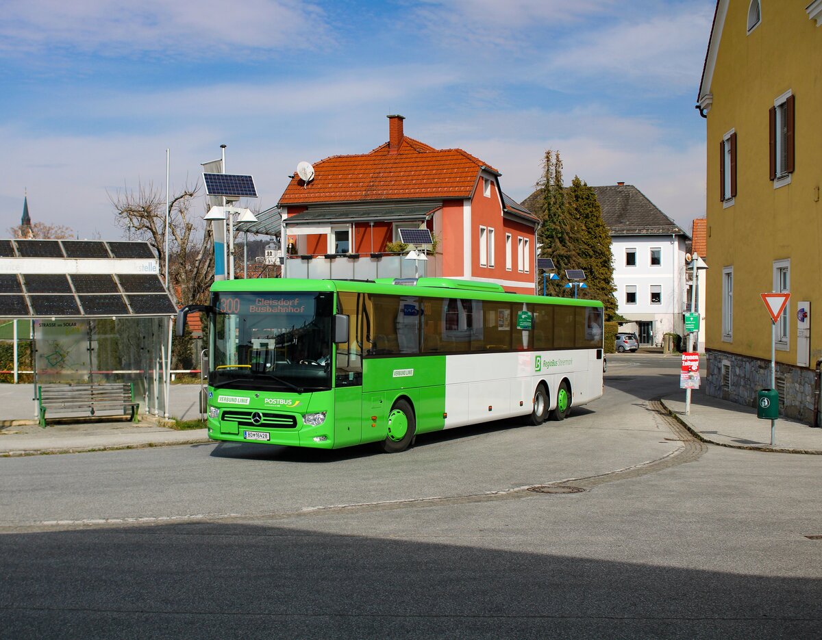 Gleisdorf. Am 19.03.2023, einem ruhigen Sonntag Nachmittag, trifft hier der Postbus BD 16428 als Linie 300 beim Bahnhof Gleisdorf ein.