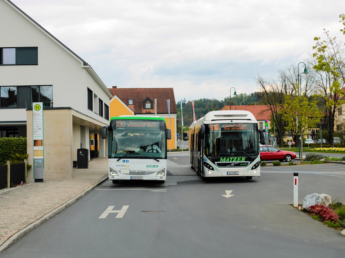 Fernitz-Mellach. Am 27.04.2023 trifft der Postbus BD 14819 auf Wagen 5 von Matzer am Erzherzog-Johann-Platz.