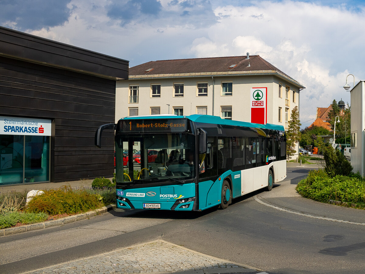Judenburg. Am 28.8.2024 ist der Postbus-Aichfeldbus 16546 auf der Linie 1 unterwegs gewesen, hier beim Finanzamt Judenburg.