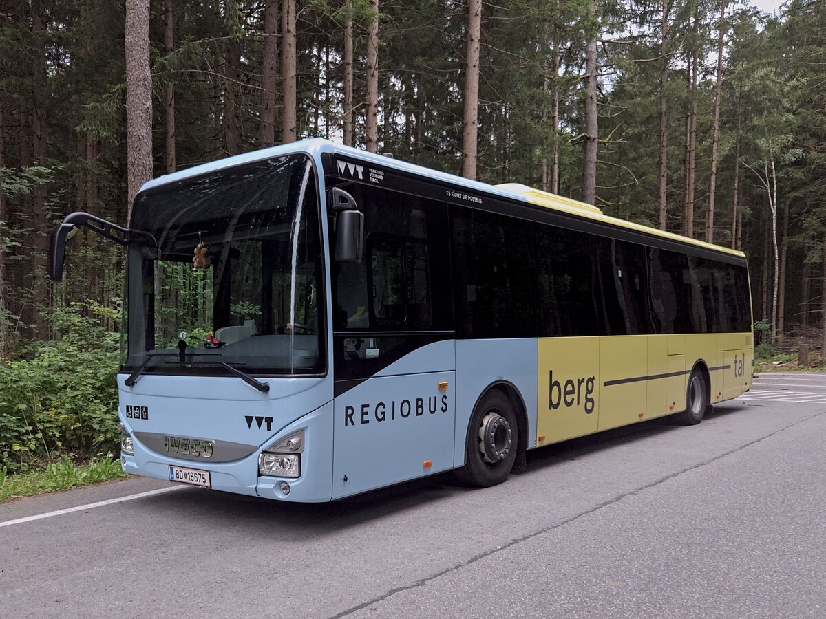Iveco-Irisbus Crossway von Postbus (BD-16675) ist in Rinn, Obere Hochstraße abgestellt. Aufgenommen 30.7.2025.