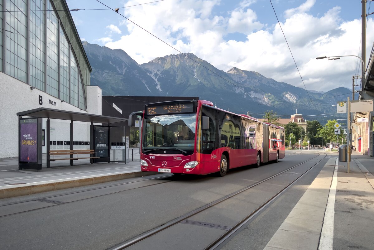Mercedes-Benz Citaro 2. Generation der Innsbrucker Verkehrsbetriebe (Bus Nr. 438) als Schienenersatzverkehr für die Straßenbahnlinie 1 an der Hst. Messe/Zeughaus in Innsbruck. Aufgenommen 11.7.2025.