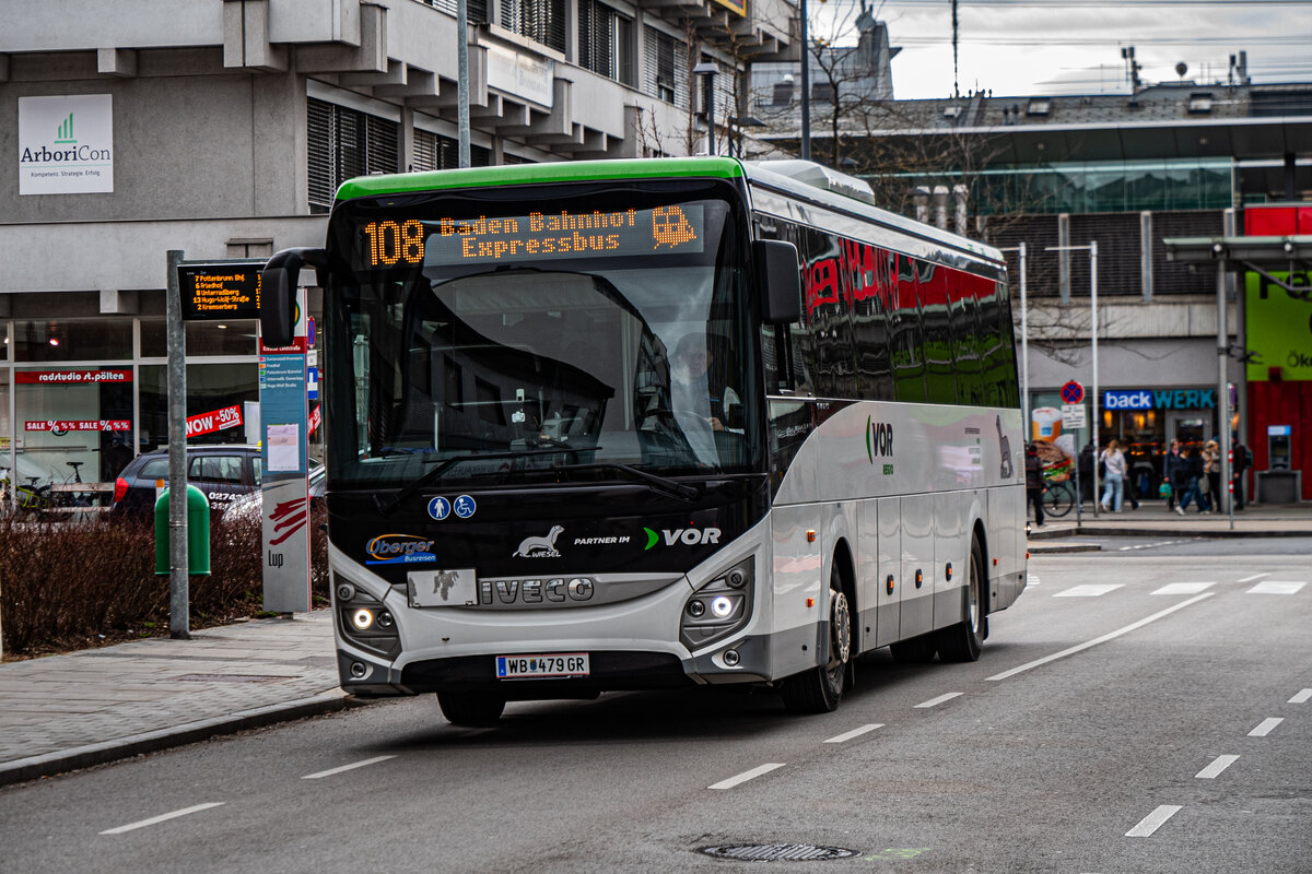 21.2.2024: Einer von Obergers Iveco Evadys (WB 479 GR) verlässt hier als Wieselbus 108 den St. Pöltner Hauptbahnhof in richtung Baden bei Wien