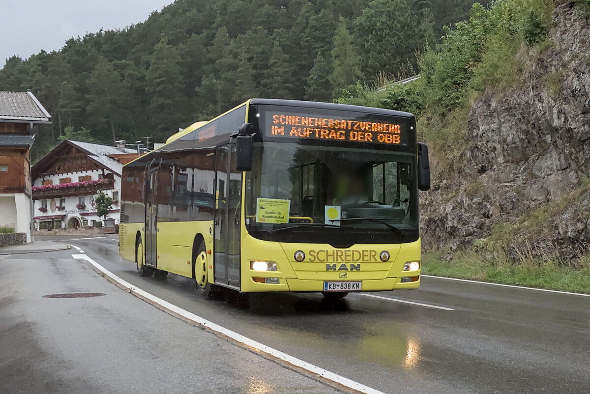 MAN Lion's City von Schreder (KB-838KN) als Schienenersatzverkehr für die Mittenwaldbahn in Reith bei Seefeld, Ortsteil Leithen. Aufgenommen 15.7.2025. stbtram