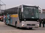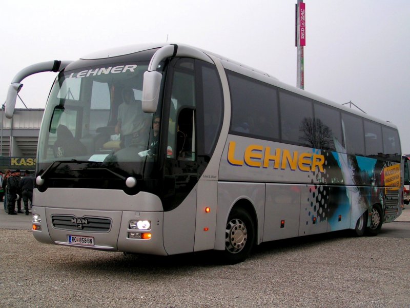 MAN des Busunternehmens Lehner wird in die vorgegebene Parkplatzlücke gelotst, Ried i.I. 080412
