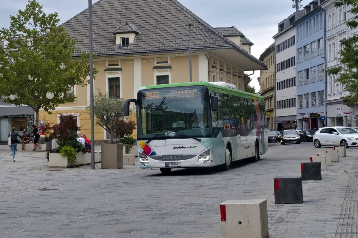 Iveco-Irisbus Crossway von Dr. Richard (Bus 4361, W-2934 LO) als Linie 8572 in Villach, Postgasse. Aufgenommen 1.9.2022.