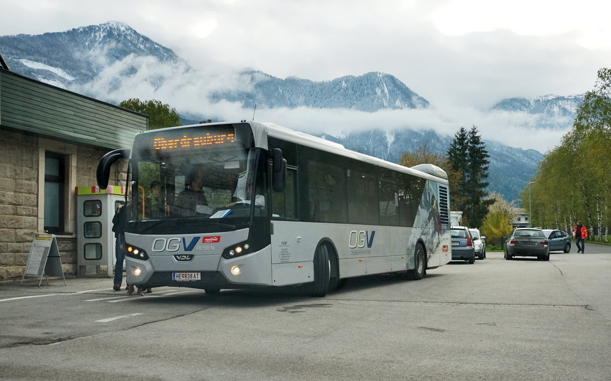 VDL Citea der OGV unterwegs auf der Kfl. 5052 (Mauthen - Oberdrauburg Bahnhof), am 28.4.2016 an der Haltestelle Oberdrauburg Bahnhof. Wenige Minuten später fährt der Bus dann wieder zurück nach Mauthen.