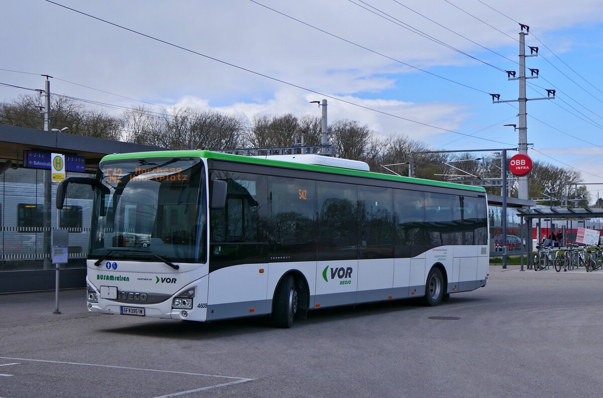 Da der Bahnhof von Marchegg weit von der eigentlichen Ortschaft entfernt liegt, verbindet die Linie 542 des Verkehrsverbundes Ost-Region (VOR) Ort und Bahnhof miteinander. Am 25.03.2024 verkehrte ein Iveco Crossway LE von BUSAM Reisen aus Gänserndorf (GF-395IW) auf dieser Linie und wurde um die Mittagszeit am Bahnhofsvorplatz von Marchegg aufgenommen.
