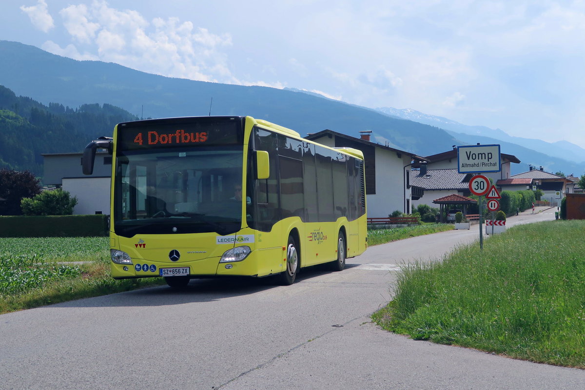 Mercedes Citaro 2. Generation von Ledermair, SZ-656ZX, als Dorfbus Schwaz Linie 4 nach der Haltestelle Vomp Altmahd. Aufgenommen 14.6.2017.