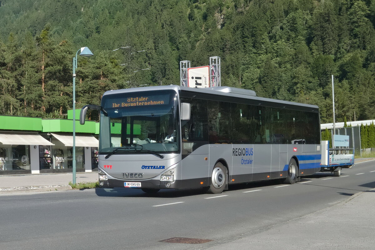 Iveco-Irisbus Crossway von Ötztaler (IM-OVG69) mit Fahrradanhänger rückt ins Depot in Ötztal-Bahnhof ein. Aufgenommen 15.6.2021.