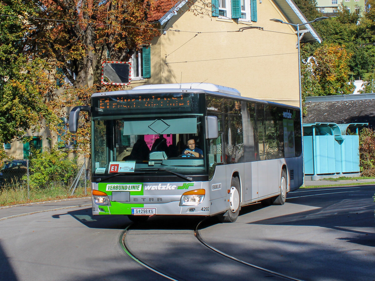 Graz. Am 6.10.2020 ist hier der W4202 von Watzke auf der Linie E1 unterwegs, abgelichtet kurz vor Mariatrost beim Tramway Museum.