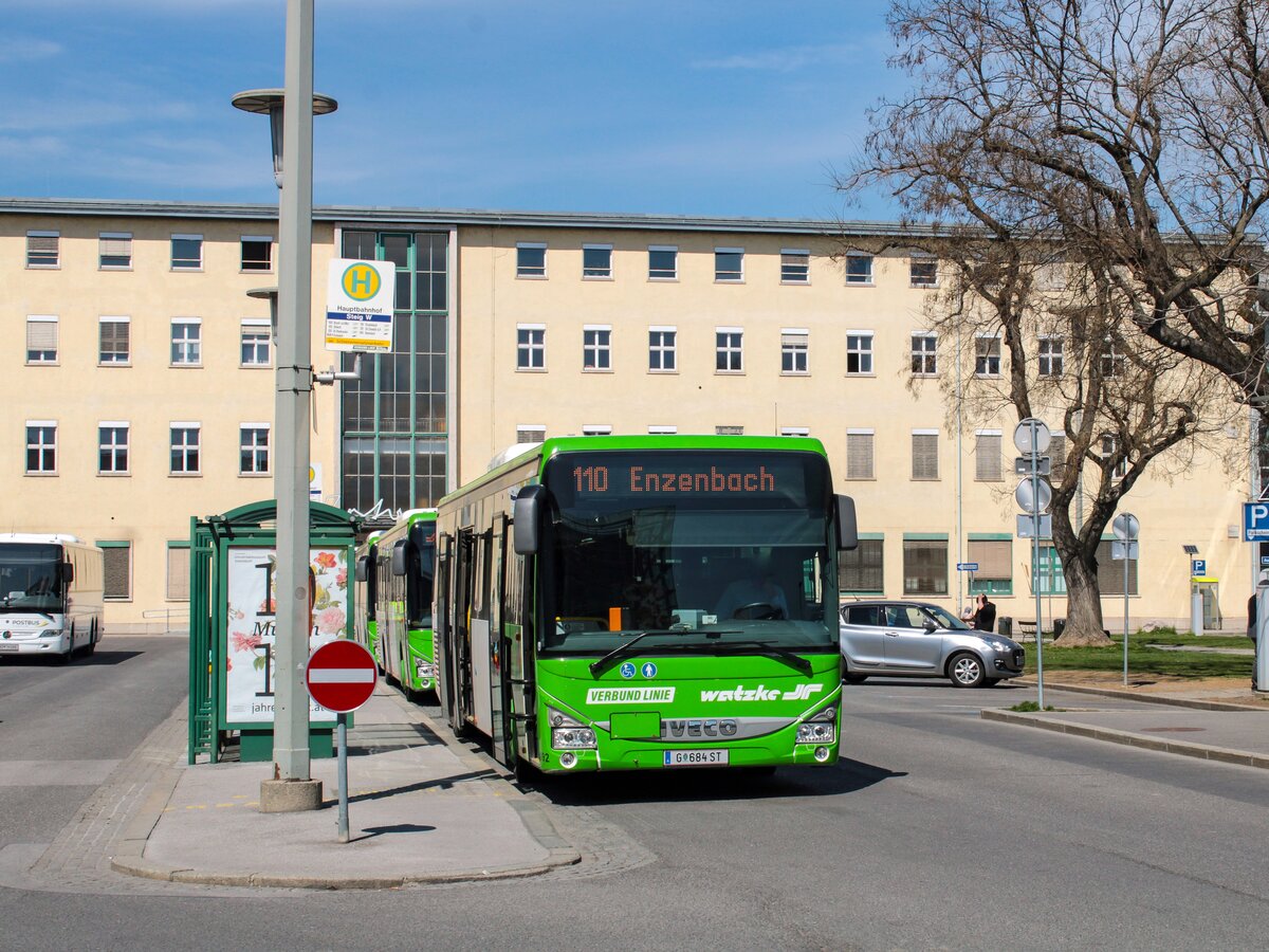 Graz. Das steirische Busunternehmen Watzke (benannt durch Anna Watzke), wird mit Frühjahr 2022 in "Dr. Richard" umbenannt. Aus diesem Grund, nutzte ich den 12.04.2022 um am Busbahnhof des Grazer HBFs Busse des Unternehmens mit dem alten Firmennamen zu fotografieren. Ein Watzke Iveco Crossway LE steht hier abfahrbereit als Linie 110 nach Enzenbach.