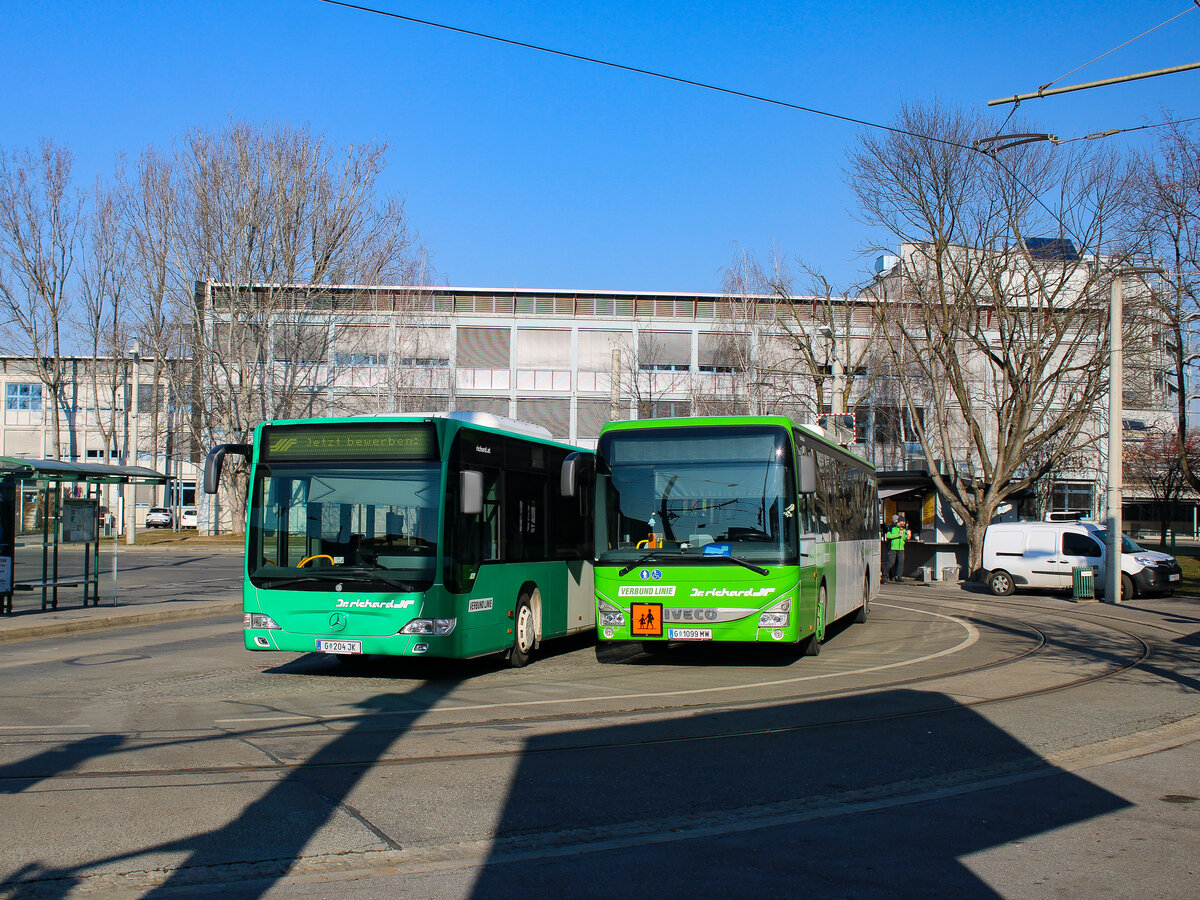 Graz. Am Vormittag des 09.02.2023 konnte ich in der Schleife Schulzentrum St. Peter die beiden Dr. Richard-Busse W1301 (Mercedes O530 FL) und W4993 (Iveco Crossway LE Line) während einer Pause fotografieren.