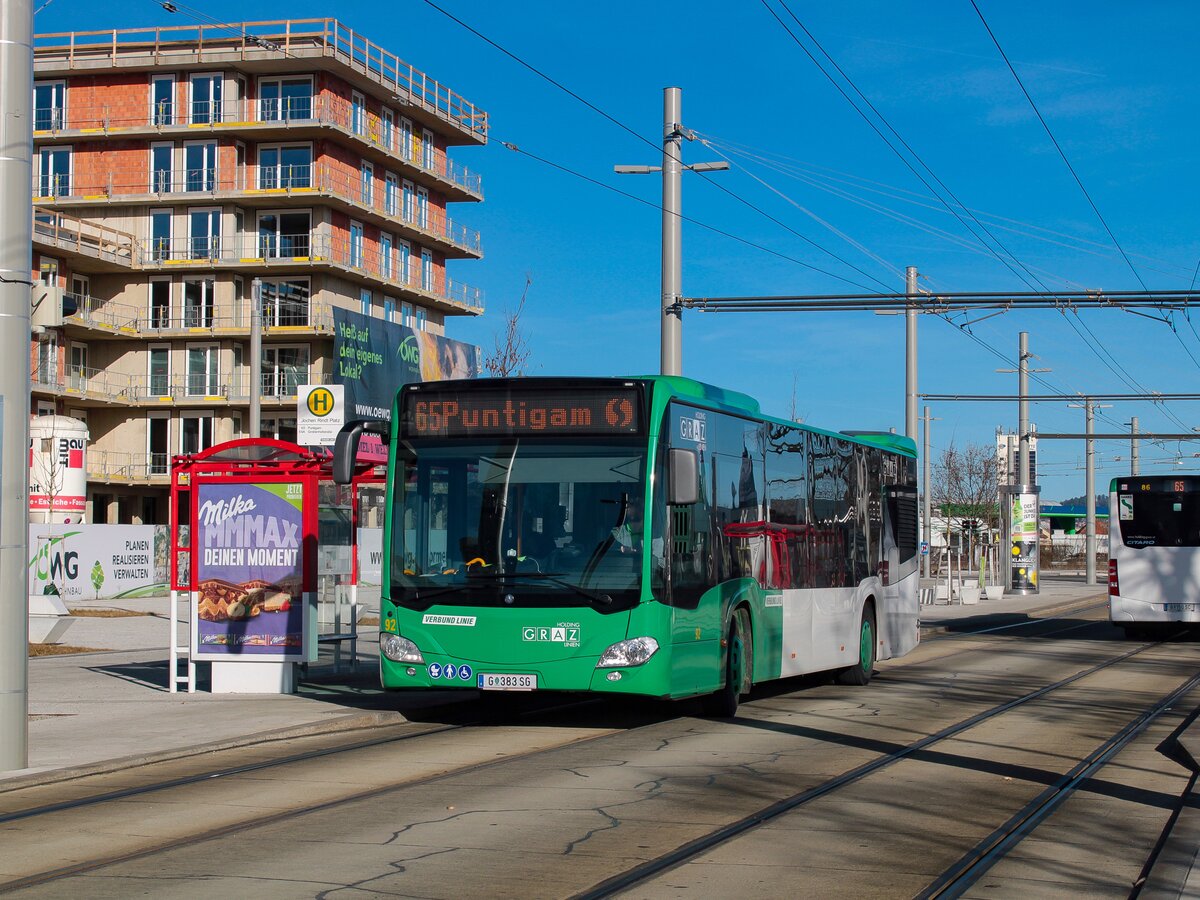 Graz. Wagen 92 der Graz Linien steht hier am 21.02.2023 als Linie 65 am Jochen-Rindt-Platz.