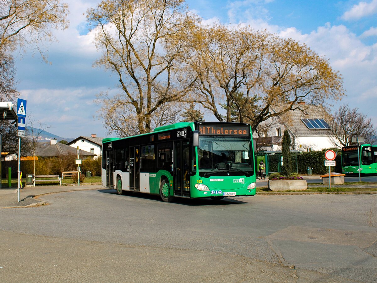 Graz. Am 5. März 2023 war der Wagen 103 der Graz Linien auf der Linie 48 zwischen Graz-Gösting und Thal Kötschberg unterwegs. Ich konnte den Bus bei der Abfahrt in Gösting ablichten.