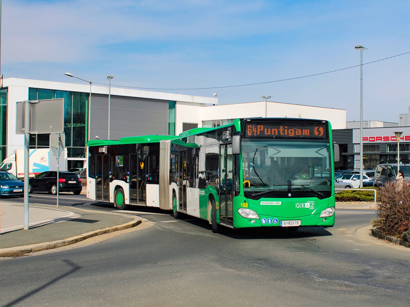 Graz. Am Vormittag des 10.03.2023 war der Graz Linien Wagen 168 auf der Linie 64 nach Puntigam unterwegs, hier aufgenommen am Ferdinand-Porsche-Platz.