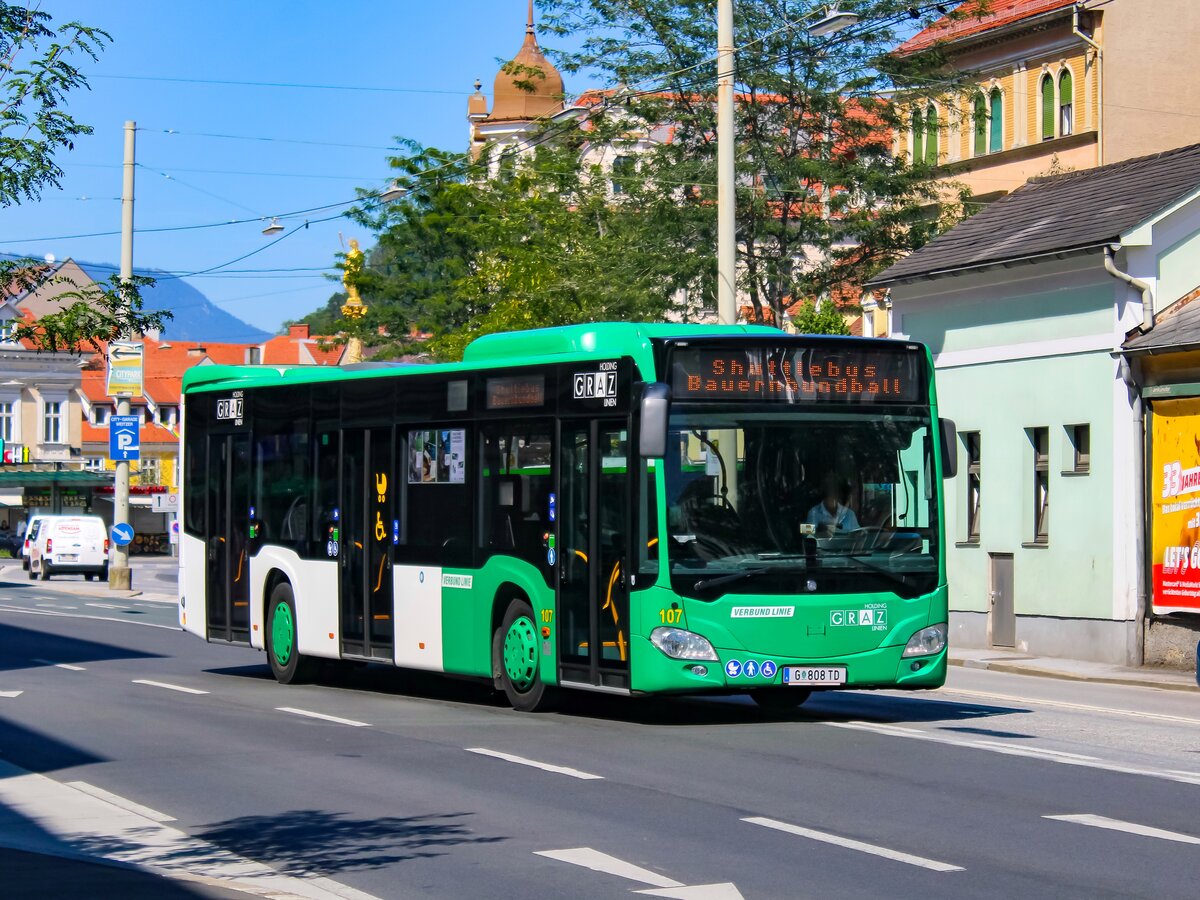 Graz. Wagen 107 der Graz Linien ist hier am 14.08.2023 als Shuttle zum Bauernbundball am Griesplatz zu sehen.